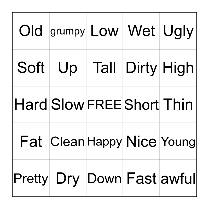 This bingo card has a free space and 24 words: Clean, Dry, Tall, Pretty, Ugly, Old, Soft, grumpy, Short, Happy, Dirty, Hard, Nice, Young, Up, Fast, Thin, Low, High, Slow, awful, Fat, Wet and Down.