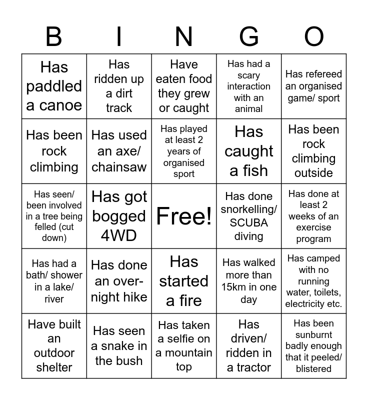 This bingo card has a free space and 25 words: Has done an over-night hike, Has taken a selfie on a mountain top, Has played at least 2 years of organised sport, Have built an outdoor shelter, Has refereed an organised game/ sport, Has paddled a canoe, Has been rock climbing, Has ridden up a dirt track, Has done snorkelling/ SCUBA diving, Has started a fire, Has caught a fish, Has seen/ been involved in a tree being felled (cut down), Has walked more than 15km in one day, Has camped with no running water, toilets, electricity etc., Has used an axe/ chainsaw, Has gone 4WD, Has done at least 2 weeks of an exercise program, Have eaten food they grew or caught, Has been rock climbing outside, Has got bogged 4WD, Has been sunburnt badly enough that it peeled/ blistered, Has seen a snake in the bush, Has had a bath/ shower in a lake/ river, Has had a scary interaction with an animal and Has driven/ ridden in a tractor.