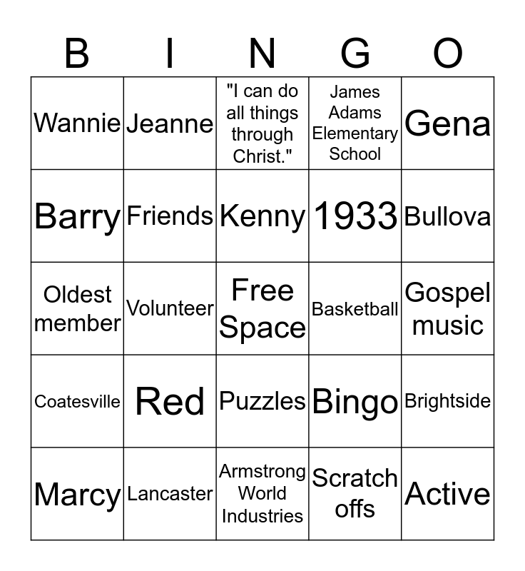 This bingo card has a free space and 24 words: Red, Lancaster, Kenny, Marcy, Gena, Wannie, Barry, Jeanne, Basketball, Puzzles, 1933, Oldest member, Bingo, Brightside, Friends, Scratch offs, Gospel music, "I can do all things through Christ.", Bullova, Volunteer, Active, Coatesville, James Adams Elementary School and Armstrong World Industries.