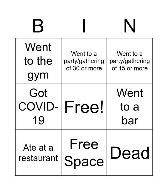 This bingo card has a free space and 9 words: Ate at a restaurant, Went to a party/gathering of 15 or more, Went to a party/gathering of 30 or more, Got COVID-19, Went to the gym, Went to a bar, Dead, Know someone who died and Free Space.
