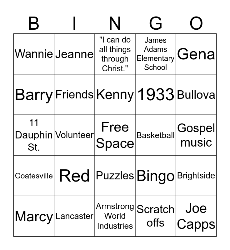 This bingo card has a free space and 24 words: Red, Lancaster, Kenny, Marcy, Gena, Wannie, Barry, Jeanne, Basketball, Puzzles, 1933, 11 Dauphin St., Bingo, Brightside, Friends, Scratch offs, Gospel music, "I can do all things through Christ.", Bullova, Volunteer, Joe Capps, Coatesville, James Adams Elementary School and Armstrong World Industries.