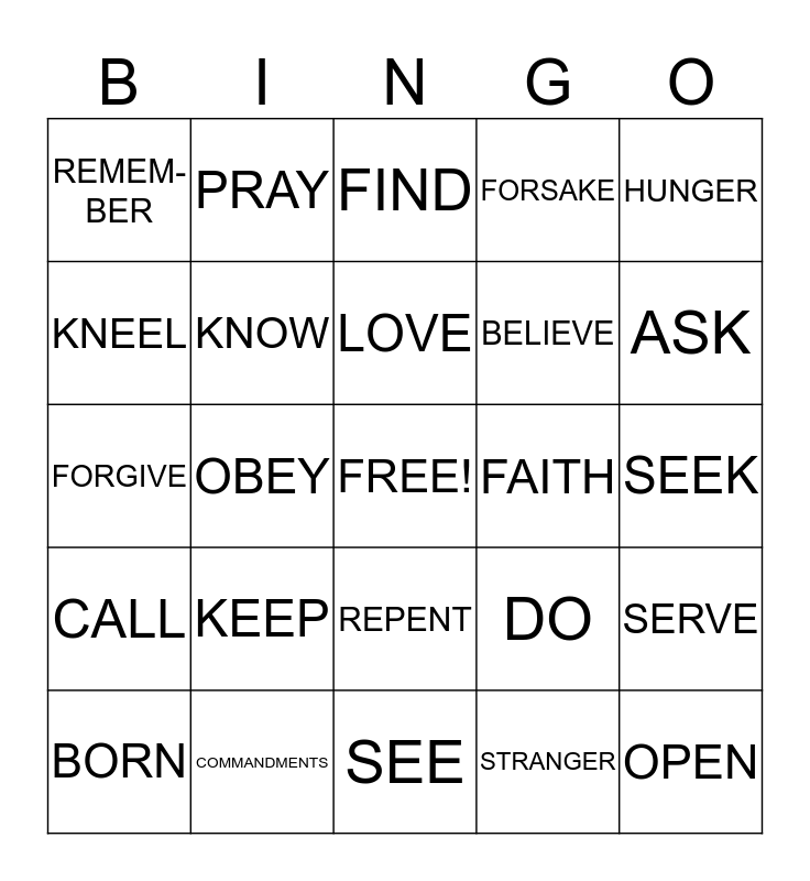 This bingo card has a free space and 24 words: KEEP, COMMANDMENTS, LOVE, BORN, HUNGER, REMEM- BER, KNEEL, PRAY, FAITH, REPENT, BELIEVE, FORGIVE, DO, SERVE, KNOW, STRANGER, SEEK, FIND, ASK, OBEY, OPEN, CALL, FORSAKE and SEE.