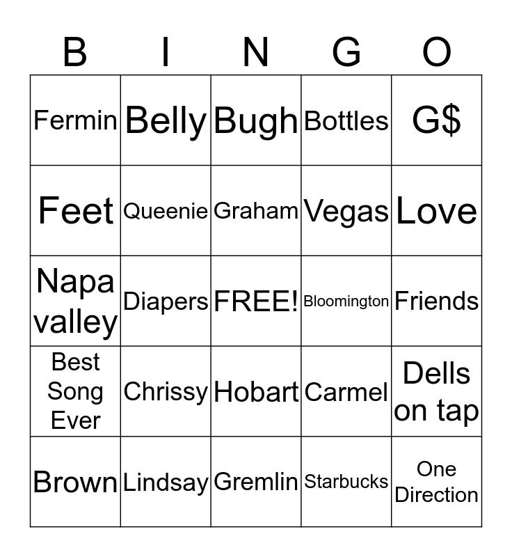 This bingo card has a free space and 24 words: Chrissy, Lindsay, Graham, Brown, G$, Fermin, Feet, Belly, Bloomington, Hobart, Vegas, Napa valley, Carmel, Dells on tap, Queenie, Starbucks, Friends, Bugh, Love, Diapers, One Direction, Best Song Ever, Bottles and Gremlin.