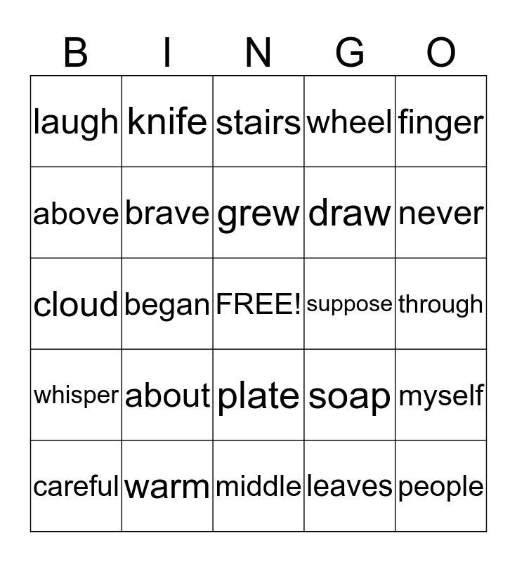 This bingo card has a free space and 24 words: about, warm, grew, careful, finger, laugh, above, knife, suppose, plate, draw, cloud, soap, myself, brave, leaves, through, stairs, never, began, people, whisper, wheel and middle.