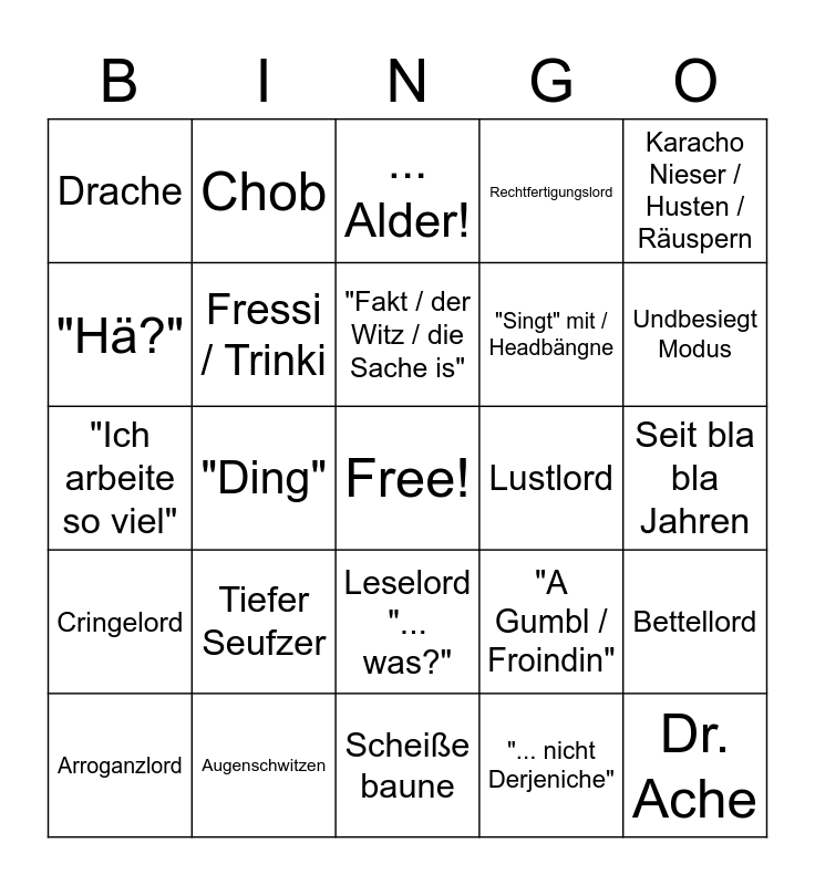 This bingo card has a free space and 25 words: Tiefer Seufzer, Scheiße baune, "Fakt / der Witz / die Sache is", Arroganzlord, Karacho Nieser / Husten / Räuspern, Drache, "Hä?", Chob, Lustlord, Leselord "... was?", "Singt" mit / Headbängne, "Ich arbeite so viel", "A Gumbl / Froindin", Bettellord, Fressi / Trinki, Grundstügg, Seit bla bla Jahren, ... Alder!, Undbesiegt Modus, "Ding", Dr. Ache, Augenschwitzen, Cringelord, Rechtfertigungslord and "... nicht Derjeniche".