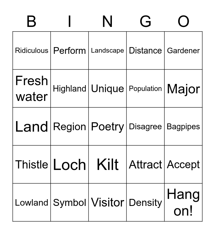 This bingo card has 29 words: Lowland, Culture, Region, Hang on!, Ridiculous, Landscape, Highland, Loch, Disagree, Symbol, Bagpipes, Poetry, Visitor, Density, Major, Land border, Kilt, Thistle, Gardener, Land, Attract, Mood, Population, Fresh water, Distance, Perform, Accept, Unique and True.