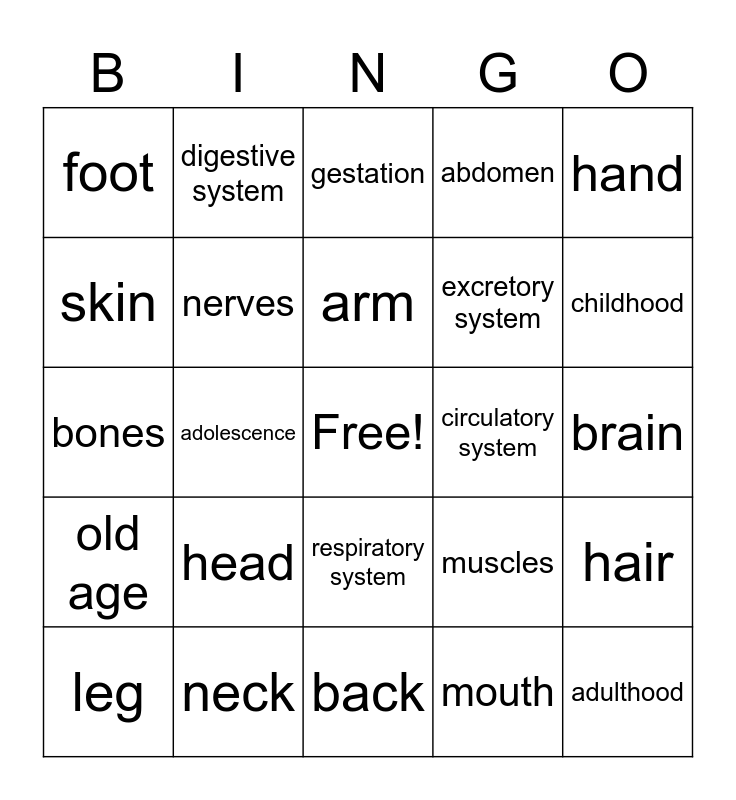This bingo card has a free space and 24 words: head, neck, arm, leg, hand, foot, skin, digestive system, circulatory system, respiratory system, excretory system, bones, muscles, hair, nerves, mouth, brain, gestation, childhood, adolescence, adulthood, old age, abdomen and back.