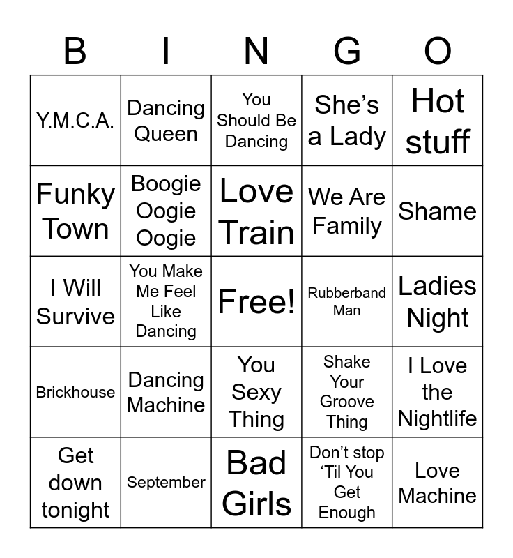 This bingo card has a free space and 24 words: Dancing Machine, September, Love Train, Get down tonight, Hot stuff, Y.M.C.A., Funky Town, Dancing Queen, Rubberband Man, You Sexy Thing, We Are Family, I Will Survive, Shake Your Groove Thing, I Love the Nightlife, Boogie Oogie Oogie, Don’t stop ‘Til You Get Enough, Ladies Night, You Should Be Dancing, Shame, You Make Me Feel Like Dancing, Love Machine, Brickhouse, She’s a Lady and Bad Girls.