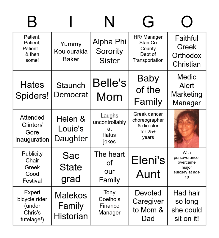 This bingo card has 1 images, a free space and 23 words: Sac State grad, Malekos Family Historian, Belle's Mom, Expert bicycle rider (under Chris's tutelage!), Faithful Greek Orthodox Christian, Patient, Patient, Patient... & then some!, Hates Spiders!, Yummy Koulourakia Baker, Greek dancer choreographer & director for 25+ years, The heart of our Family, Baby of the Family, Attended Clinton/ Gore Inauguration, Eleni's Aunt, With perseverance, overcame major surgery at age 10, Staunch Democrat, Devoted Caregiver to Mom & Dad, Alpha Phi Sorority Sister, Medic Alert Marketing Manager, Helen & Louie's Daughter, Had hair so long she could sit on it!, Publicity Chair Greek Good Festival, HR/ Manager Stan Co County Dept of Transportation and Tony Coelho's Finance Manager.