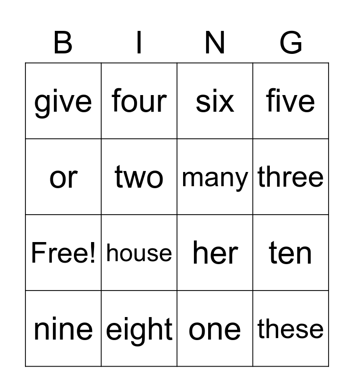 This bingo card has 20 words: ten, day, six, so, nine, or, eight, give, Free!, four, house, her, two, these, many, some, three, five, one and seven.