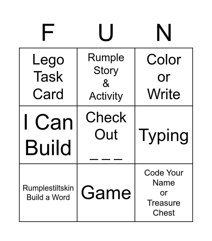 This bingo card has a free space and 8 words: Typing, Color or Write, Rumple Story & Activity, Rumplestiltskin Build a Word, Lego Task Card, Code Your Name or Treasure Chest, I Can Build and Game.