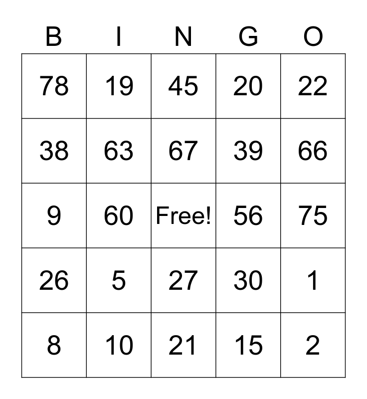 This bingo card has a free space and 24 words: 5, 10, 67, 8, 22, 78, 38, 19, 56, 27, 39, 9, 30, 1, 63, 15, 75, 45, 66, 60, 2, 26, 20 and 21.