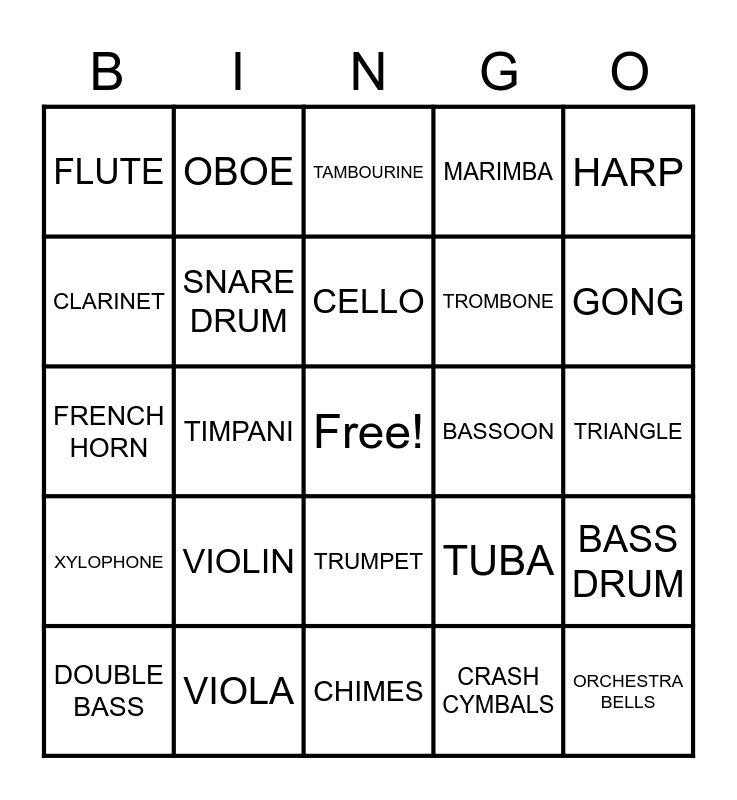 This bingo card has a free space and 24 words: VIOLIN, VIOLA, CELLO, DOUBLE BASS, HARP, FLUTE, CLARINET, OBOE, BASSOON, TRUMPET, TROMBONE, FRENCH HORN, TUBA, BASS DRUM, SNARE DRUM, CRASH CYMBALS, TRIANGLE, TAMBOURINE, GONG, TIMPANI, ORCHESTRA BELLS, XYLOPHONE, MARIMBA and CHIMES.