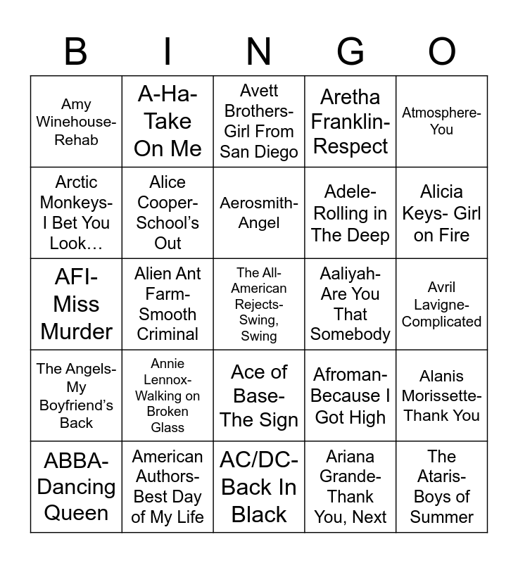This bingo card has 25 words: Annie Lennox-Walking on Broken Glass, AC/DC- Back In Black, Aerosmith- Angel, ABBA- Dancing Queen, Atmosphere- You, Amy Winehouse- Rehab, Arctic Monkeys- I Bet You Look…, A-Ha- Take On Me, Aaliyah- Are You That Somebody, Ace of Base- The Sign, Adele- Rolling in The Deep, AFI- Miss Murder, Afroman- Because I Got High, Alanis Morissette- Thank You, Alice Cooper- School’s Out, The Ataris- Boys of Summer, Avril Lavigne- Complicated, Avett Brothers- Girl From San Diego, Alicia Keys- Girl on Fire, Alien Ant Farm- Smooth Criminal, The All-American Rejects- Swing, Swing, American Authors- Best Day of My Life, The Angels- My Boyfriend’s Back, Aretha Franklin- Respect and Ariana Grande- Thank You, Next.