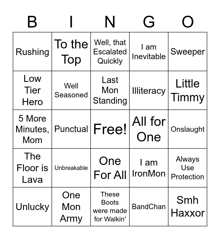 This bingo card has a free space and 24 words: Unbreakable, One Mon Army, Last Mon Standing, Unlucky, Sweeper, Rushing, Low Tier Hero, To the Top, All for One, One For All, Illiteracy, 5 More Minutes, Mom, I am IronMon, Always Use Protection, Well Seasoned, BandChan, Onslaught, Well, that Escalated Quickly, Little Timmy, Punctual, Smh Haxxor, The Floor is Lava, I am Inevitable and These Boots were made for Walkin'.