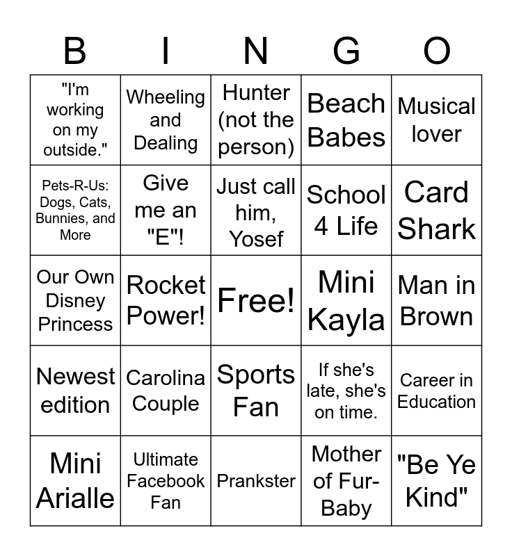 This bingo card has a free space and 24 words: Carolina Couple, Ultimate Facebook Fan, Just call him, Yosef, Mini Arialle, Musical lover, "I'm working on my outside.", Pets-R-Us: Dogs, Cats, Bunnies, and More, Wheeling and Dealing, Mini Kayla, Sports Fan, School 4 Life, Our Own Disney Princess, If she's late, she's on time., Career in Education, Give me an "E"!, Mother of Fur-Baby, Man in Brown, Hunter (not the person), Card Shark, Rocket Power!, "Be Ye Kind", Newest edition, Beach Babes and Prankster.