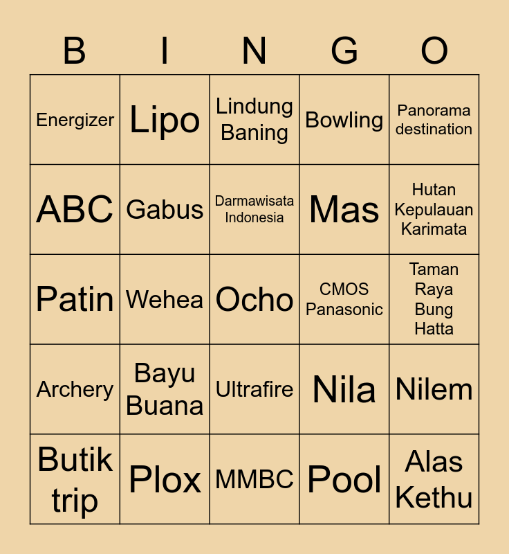 This bingo card has 25 words: Bayu Buana, MMBC, Darmawisata Indonesia, Butik trip, Panorama destination, Energizer, ABC, Lipo, CMOS Panasonic, Ultrafire, Mas, Patin, Nila, Nilem, Gabus, Alas Kethu, Taman Raya Bung Hatta, Lindung Baning, Hutan Kepulauan Karimata, Wehea, Ocho, Plox, Archery, Bowling and Pool.