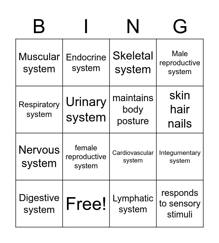 This bingo card has 16 words: Free!, Integumentary system, Skeletal system, Muscular system, Nervous system, Endocrine system, Cardiovascular system, Lymphatic system, Respiratory system, Urinary system, Digestive system, Male reproductive system, female reproductive system, skin hair nails, maintains body posture and responds to sensory stimuli.