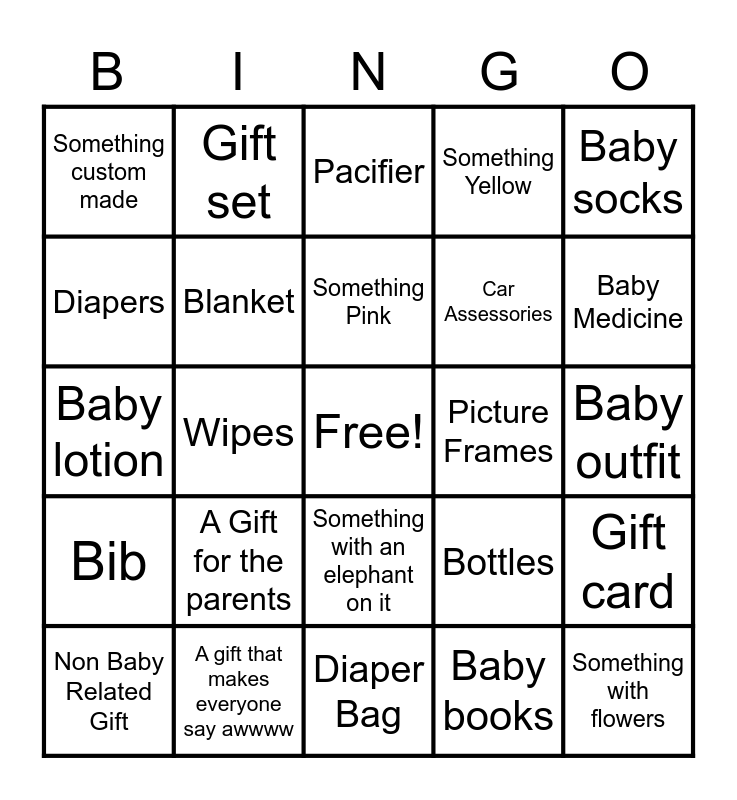 This bingo card has a free space and 24 words: A Gift for the parents, A gift that makes everyone say awwww, Something Pink, Non Baby Related Gift, Baby socks, Something custom made, Diapers, Gift set, Picture Frames, Something with an elephant on it, Car Assessories, Baby lotion, Bottles, Gift card, Blanket, Baby books, Baby outfit, Pacifier, Baby Medicine, Wipes, Something with flowers, Bib, Something Yellow and Diaper Bag.