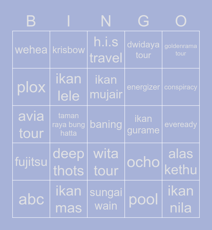 This bingo card has 25 words: deep thots, sungai wain, ikan mujair, abc, goldenrama tour, wehea, plox, krisbow, ikan gurame, wita tour, energizer, avia tour, ocho, alas kethu, ikan lele, ikan nila, eveready, h.i.s travel, conspiracy, taman raya bung hatta, baning, ikan mas, fujitsu, dwidaya tour and pool.