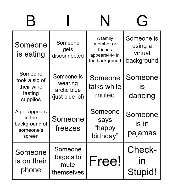 This bingo card has 17 words: Free!, Someone is on their phone, A family member or friends appears444 in the background, Someone is eating, Someone freezes, Someone is using a virtual background, Someone is in pajamas, Someone talks while muted, Someone is dancing, Someone is wearing arctic blue (just blue lol), Someone forgets to mute themselves, Someone says “happy birthday”, Someone took a sip of their wine tasting supplies, Someone gets disconnected, A pet appears in the background of someone’s screen, Someone else in the chat has a birthday in February and Check-in Stupid!.