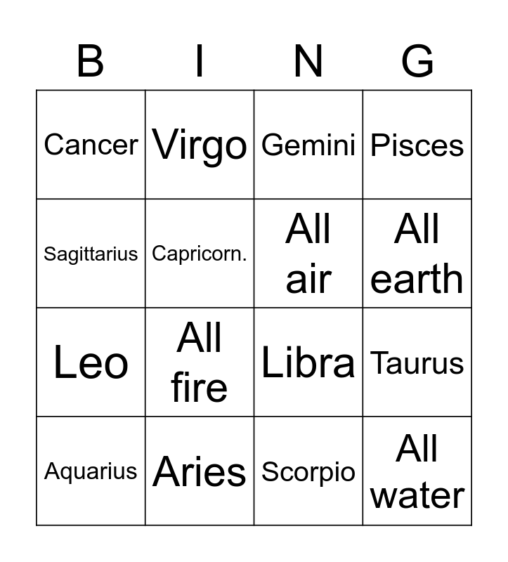 This bingo card has 16 words: Aries, Taurus, Gemini, Cancer, Leo, Virgo, Libra, Scorpio, Sagittarius, Capricorn., Aquarius, Pisces, All fire, All earth, All air and All water.