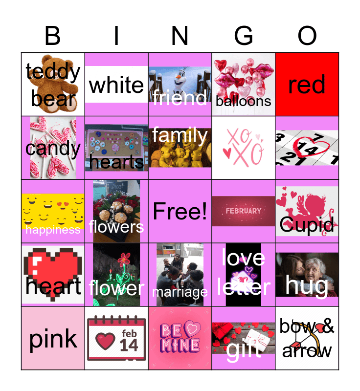 This bingo card has 33 images, a free space and 27 words: chocolate box, flowers, bouquet, heart, hearts, red, pink, white, love, family, friend, friends, friendship, happiness, flower, love letter, marriage, kiss, teddy bear, Cupid, bow & arrow, balloons, candy, hug, secret admirer, gift and happy.