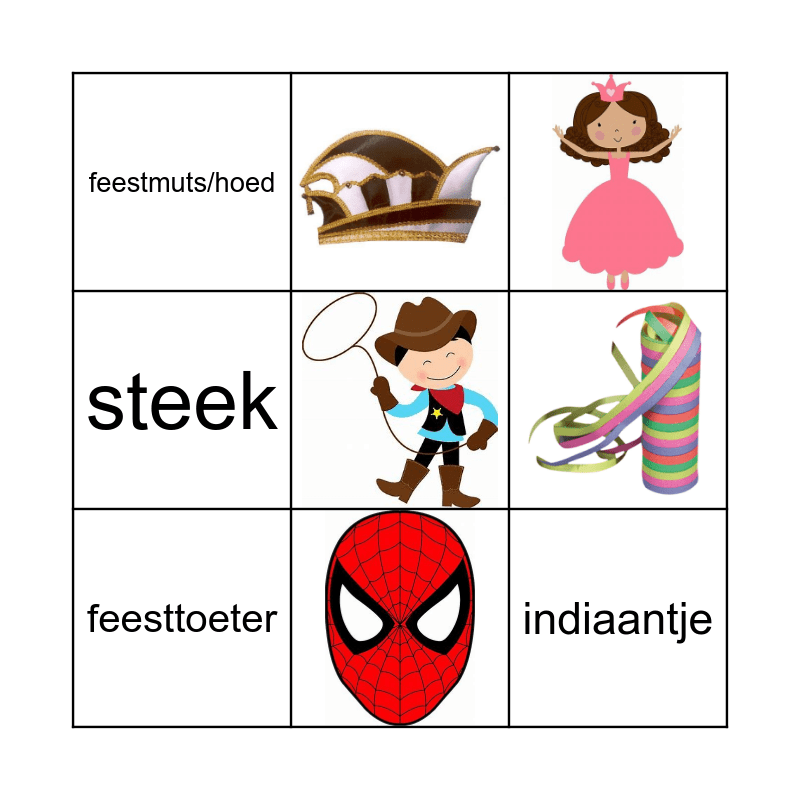 This bingo card has 21 images and 21 words: confetti, spiderman masker, feestmuts/hoed, trommel, clown, indiaantje, polonaise, ballonnen, prinses, sambaballen, pannenkoek/spekstruif, feesttoeter, mini mouse, cowboy, roodkapje, strik, aap, vlag, feestneus, steek and serpentines.