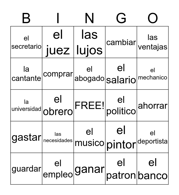 This bingo card has a free space and 24 words: las necesidades, el empleo, el abogado, guardar, las ventajas, el secretario, la cantante, el juez, el politico, el musico, el salario, la universidad, el pintor, el deportista, comprar, el patron, ahorrar, las lujos, el mechanico, el obrero, el banco, gastar, cambiar and ganar.