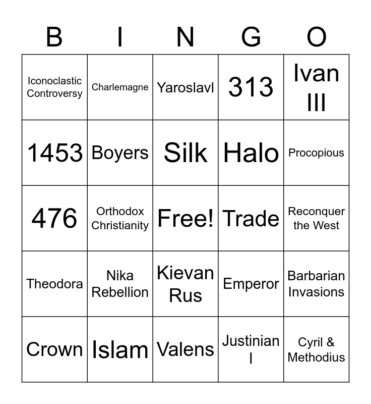 This bingo card has a free space and 31 words: Valens, Peninsula, Orthodox Christianity, Edict of Milan, Iconoclastic Controversy, Yaroslavl, Boyers, Emperor, Trade, Justinian I, Reconquer the West, Cyril & Methodius, Great Schism 1054, Belasarius, Procopious, Icon, Barbarian Invasions, Nika Rebellion, Theodora, Kievan Rus, Ivan III, Hagia Sophia, Crown, Charlemagne, Halo, 1453, 313, 476, Islam, Silk and Church of Saint Vitale.