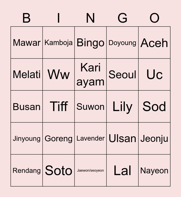 This bingo card has a free space and 24 words: Goreng, Soto, Kari ayam, Rendang, Aceh, Mawar, Melati, Kamboja, Lily, Lavender, Seoul, Busan, Ulsan, Jeonju, Ww, Lal, Sod, Bingo, Uc, Tiff, Nayeon, Jinyoung, Doyoung and Jaewon/seoyeon.