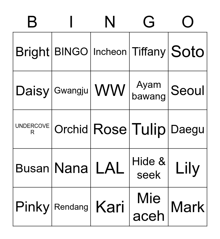This bingo card has a free space and 24 words: Nana, Rendang, WW, Pinky, Soto, Bright, Daisy, BINGO, Tulip, LAL, Ayam bawang, UNDERCOVE R, Hide & seek, Lily, Gwangju, Mie aceh, Daegu, Incheon, Seoul, Orchid, Mark, Busan, Tiffany and Kari.