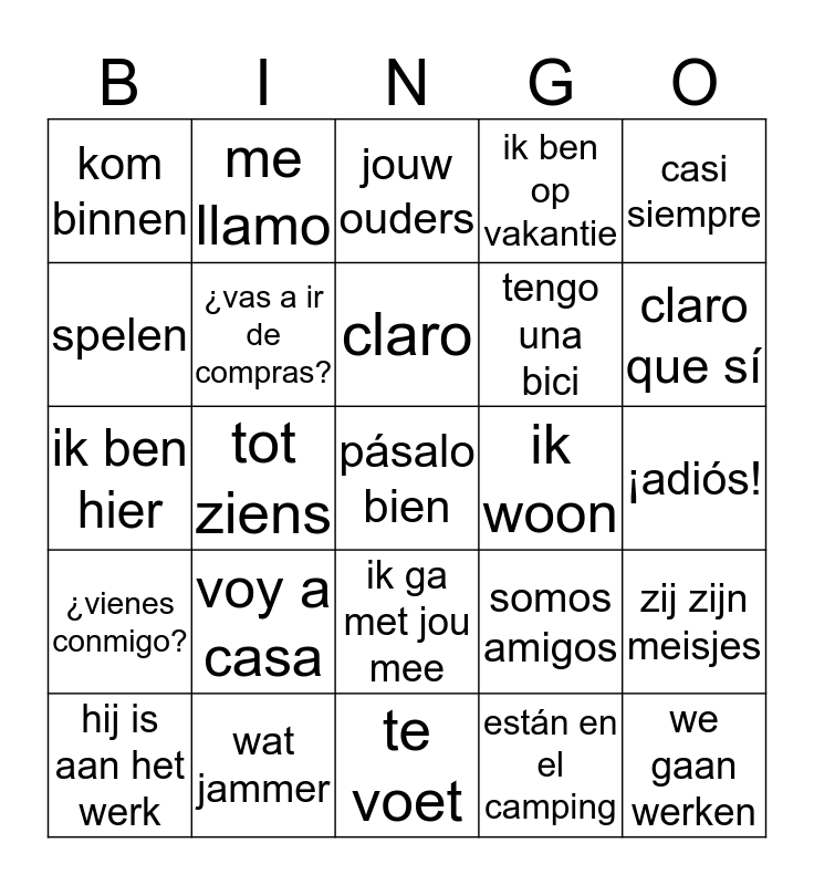 This bingo card has 25 words: voy a casa, te voet, claro, hij is aan het werk, casi siempre, kom binnen, spelen, me llamo, ik woon, ik ga met jou mee, tengo una bici, ik ben hier, somos amigos, zij zijn meisjes, ¿vas a ir de compras?, we gaan werken, ¡adiós!, jouw ouders, claro que sí, tot ziens, pásalo bien, wat jammer, ¿vienes conmigo?, ik ben op vakantie and están en el camping.
