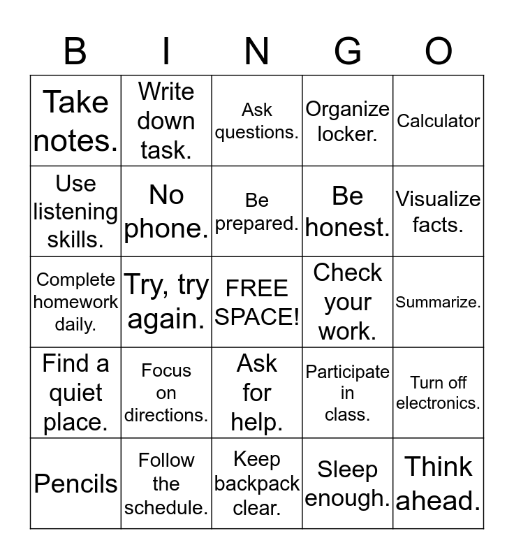 This bingo card has a free space and 24 words: Focus on directions., Follow the schedule., Be prepared., Pencils, Calculator, Take notes., Use listening skills., Write down task., Check your work., Ask for help., Be honest., Complete homework daily., Participate in class., Turn off electronics., No phone., Sleep enough., Summarize., Ask questions., Visualize facts., Try, try again., Think ahead., Find a quiet place., Organize locker. and Keep backpack clear..