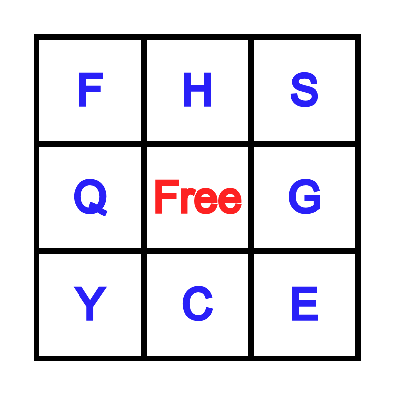 This bingo card has a free space and 26 words: A, B, C, D, E, F, G, H, I, J, K, L, M, N, O, P, Q, R, S, T, U, V, W, X, Y and Z.