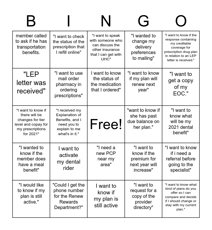 This bingo card has a free space and 24 words: I want to activate my dental rider, "Could I get the phone number for the Renew Rewards Department?", I want to know the status of the medication that I ordered", "I would like to know if my plan is still active.", "I want to know if the response containing my creditable coverage for prescription drug plan in relation to an LEP letter is received.", member called to ask if he has transportation benefits., "LEP letter was received", "I want to check the status of the prescription that I refill online", "want to know if she has past due balance on her plan.", "I need a new PCP near my area", "I want to know if my plan will renew next year", "I want to know if there will be changes for tier level and copay for my prescriptions for 2021", "I want to know if the premium for next year will increase", "I want to know if i need a referral before going to the specialist", "I want to use mail order pharmacy in ordering prescriptions", "I want to request for a copy of the provider directory", "I want to know what will be my 2021 dental benefit", "I want to speak with someone who can discuss the other insurance that I can get with UHC", "I want to get a copy of my EOC.", "I received my Explanation of Benefits, and I need you to explain to me what's in it.", "I want to know what kind of plans do you offer so I can compare and decide if I should change or stay with my current plan.", "I wanted to know if the member does have a meal benefit", "I wanted to change my delivery preferences to mailing" and I want to know if my plan is still active.