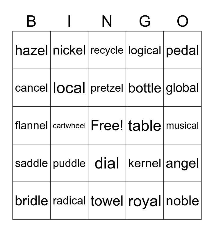 This bingo card has a free space and 24 words: puddle, radical, pretzel, bridle, pedal, hazel, cancel, nickel, table, dial, bottle, flannel, kernel, angel, local, royal, musical, recycle, global, cartwheel, noble, saddle, logical and towel.