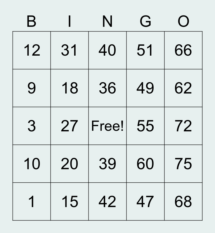 This bingo card has a free space and 24 words: 1, 20, 36, 47, 66, 12, 31, 40, 55, 72, 3, 18, 60, 75, 9, 15, 42, 51, 62, 10, 27, 39, 49 and 68.