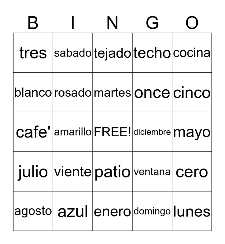 This bingo card has a free space and 24 words: viente, azul, martes, agosto, cocina, tres, blanco, sabado, diciembre, patio, once, cafe', ventana, cero, rosado, domingo, mayo, tejado, cinco, amarillo, lunes, julio, techo and enero.