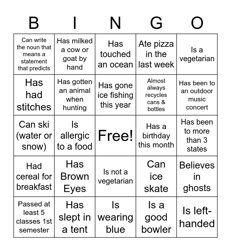 This bingo card has a free space and 24 words: Has Brown Eyes, Has slept in a tent, Has gone ice fishing this year, Passed at least 5 classes 1st semester, Is a vegetarian, Can write the noun that means a statement that predicts, Has had stitches, Has milked a cow or goat by hand, Has a birthday this month, Is not a vegetarian, Almost always recycles cans & bottles, Can ski (water or snow), Can ice skate, Believes in ghosts, Has gotten an animal when hunting, Is a good bowler, Has been to more than 3 states, Has touched an ocean, Has been to an outdoor music concert, Is allergic to a food, Is left-handed, Had cereal for breakfast, Ate pizza in the last week and Is wearing blue.