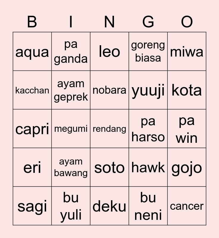 This bingo card has a free space and 24 words: ayam bawang, bu yuli, nobara, sagi, miwa, aqua, kacchan, pa ganda, pa harso, soto, yuuji, capri, hawk, gojo, ayam geprek, bu neni, pa win, leo, kota, megumi, cancer, eri, goreng biasa and deku.