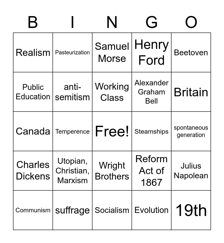 This bingo card has a free space and 24 words: Utopian, Christian, Marxism, suffrage, Working Class, Communism, Beetoven, Realism, Public Education, Pasteurization, Steamships, Wright Brothers, Alexander Graham Bell, Canada, Reform Act of 1867, Julius Napolean, anti-semitism, Evolution, spontaneous generation, Samuel Morse, Britain, Temperence, 19th, Charles Dickens, Henry Ford and Socialism.