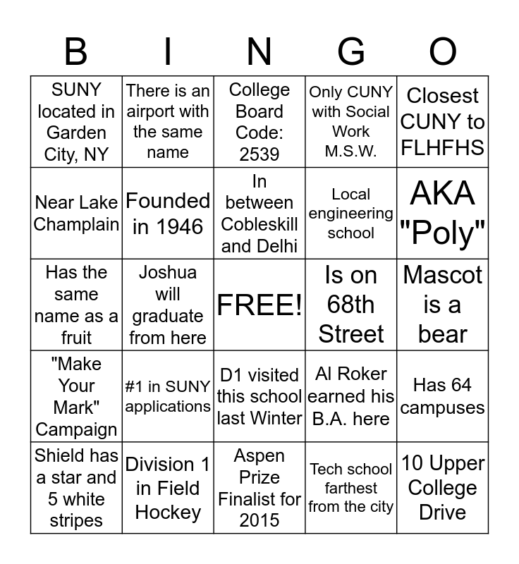 This bingo card has a free space and 24 words: #1 in SUNY applications, Division 1 in Field Hockey, In between Cobleskill and Delhi, Shield has a star and 5 white stripes, Closest CUNY to FLHFHS, SUNY located in Garden City, NY, Near Lake Champlain, There is an airport with the same name, Is on 68th Street, D1 visited this school last Winter, Local engineering school, Has the same name as a fruit, Al Roker earned his B.A. here, Has 64 campuses, Founded in 1946, Tech school farthest from the city, Mascot is a bear, College Board Code: 2539, AKA "Poly", Joshua will graduate from here, 10 Upper College Drive, "Make Your Mark" Campaign, Only CUNY with Social Work M.S.W. and Aspen Prize Finalist for 2015.