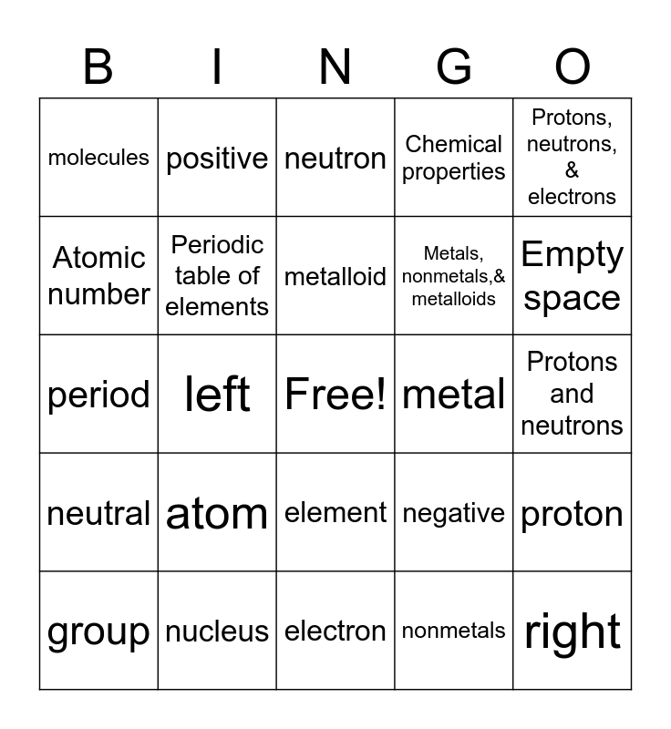 This bingo card has a free space and 24 words: atom, nucleus, metalloid, group, Protons, neutrons, & electrons, molecules, Atomic number, positive, metal, element, Metals, nonmetals,& metalloids, period, negative, proton, Periodic table of elements, nonmetals, Protons and neutrons, neutron, Empty space, left, right, neutral, Chemical properties and electron.