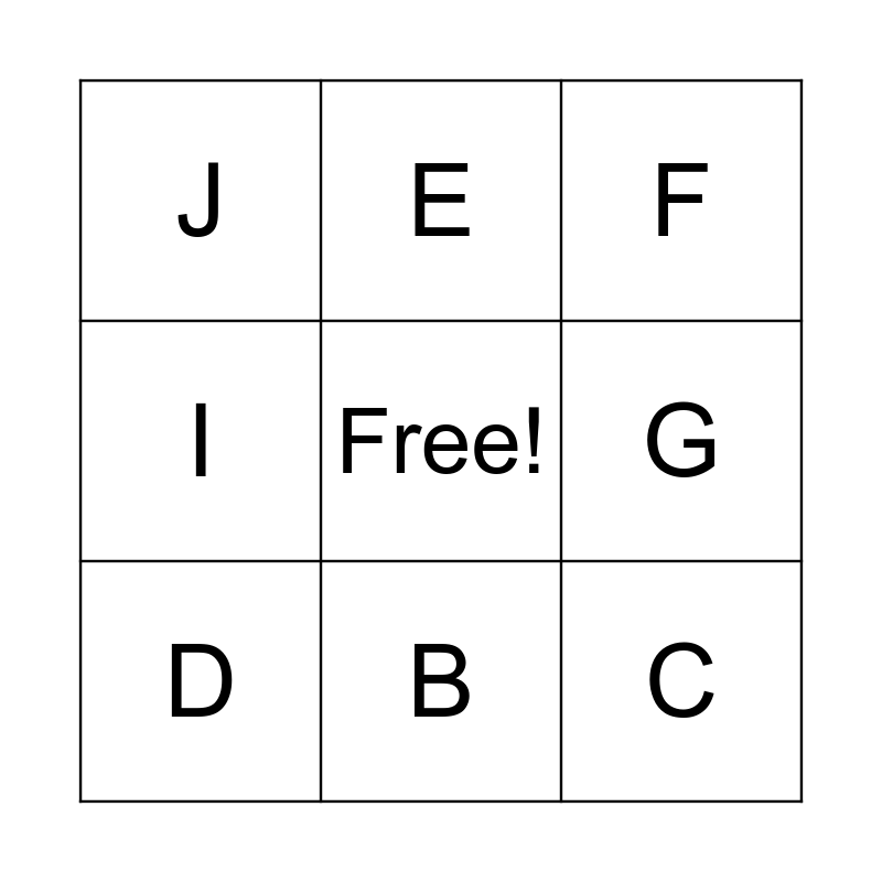 This bingo card has a free space and 11 words: A, B, C, D, E, F, G, H, I, J and K.