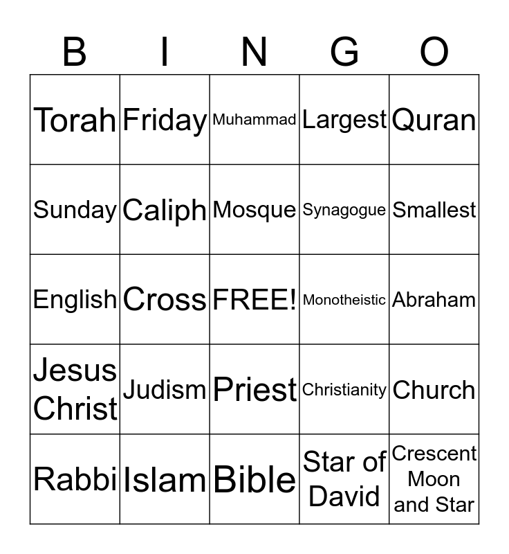 This bingo card has a free space and 24 words: Judism, Islam, Mosque, Rabbi, Quran, Torah, Sunday, Friday, Monotheistic, Priest, Synagogue, English, Christianity, Church, Caliph, Star of David, Abraham, Muhammad, Smallest, Cross, Crescent Moon and Star, Jesus Christ, Largest and Bible.