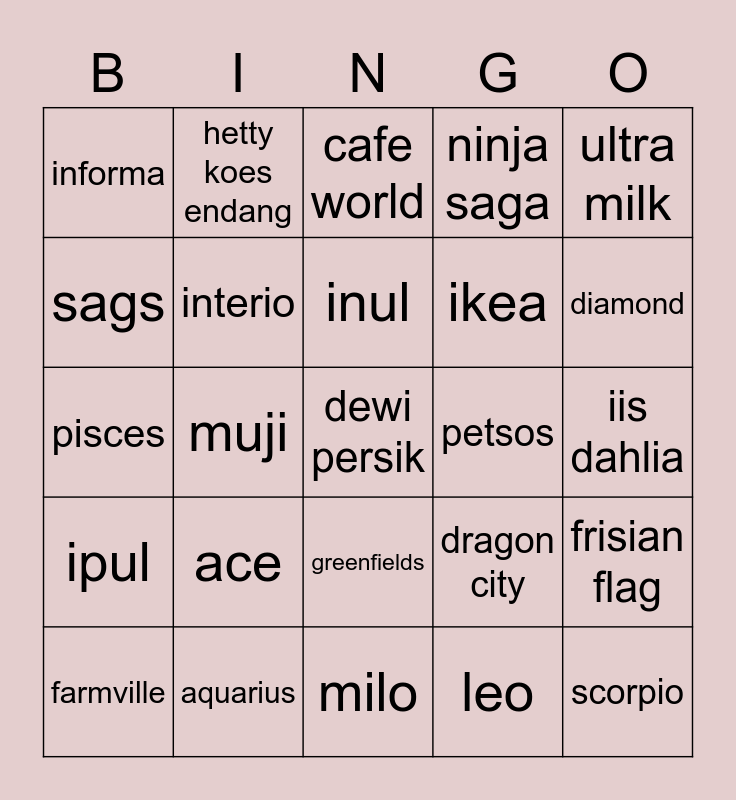 This bingo card has a free space and 24 words: ace, aquarius, inul, farmville, ultra milk, informa, sags, hetty koes endang, petsos, greenfields, ikea, pisces, dragon city, frisian flag, interio, leo, iis dahlia, cafe world, diamond, muji, scorpio, ipul, ninja saga and milo.