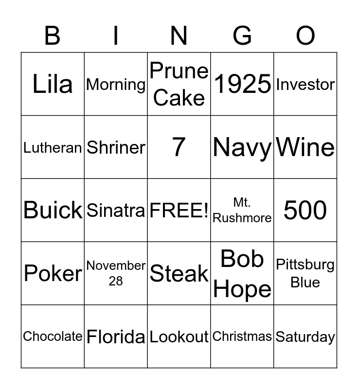 This bingo card has a free space and 24 words: November 28, Florida, 7, Chocolate, Investor, Lila, Lutheran, Morning, Mt. Rushmore, Steak, Navy, Buick, Bob Hope, Pittsburg Blue, Shriner, Christmas, 500, Prune Cake, Wine, Sinatra, Saturday, Poker, 1925 and Lookout.