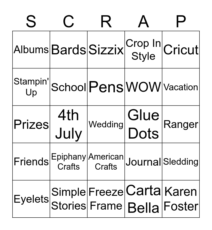 This bingo card has 25 words: Epiphany Crafts, Freeze Frame, Pens, Eyelets, Cricut, Albums, Stampin' Up, Bards, Glue Dots, American Crafts, WOW, Prizes, Journal, Sledding, School, Karen Foster, Ranger, Sizzix, Vacation, 4th July, Wedding, Simple Stories, Friends, Crop In Style and Carta Bella.