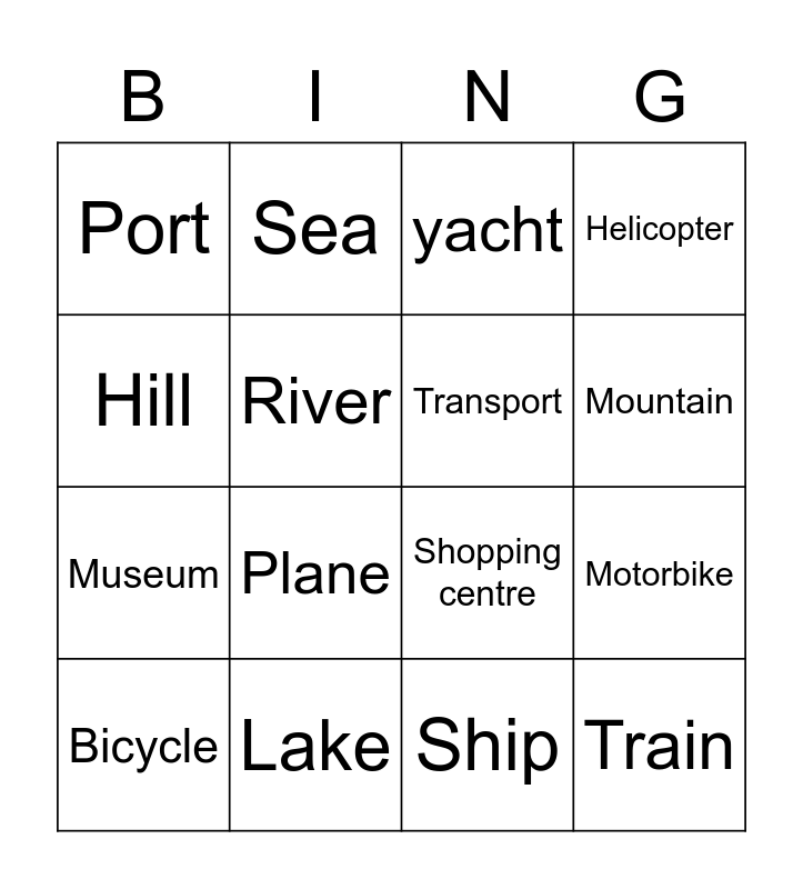 This bingo card has 25 words: Place, Countryside, Mountain, Forest, Hill, Port, River, Sea, Lake, City, Museum, Shopping centre, Cathedral, park, Transport, Car, Ship, yacht, Plane, Motorbike, Bicycle, Bus, Train, Helicopter and Space ship.